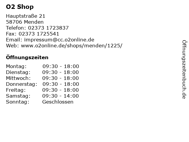 | Öffnungszeiten O2 Shop in Menden anzeigen | |