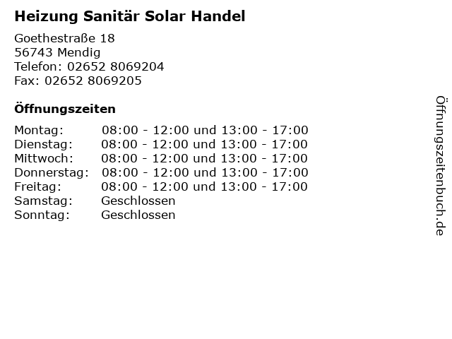 | Öffnungszeiten Heizung Sanitär Solar Handel in Mendig anzeigen | |