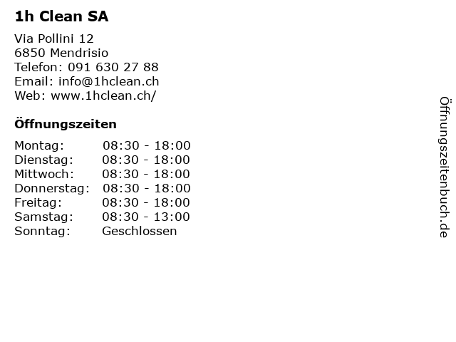 | Öffnungszeiten 1h Clean SA in Mendrisio anzeigen | |