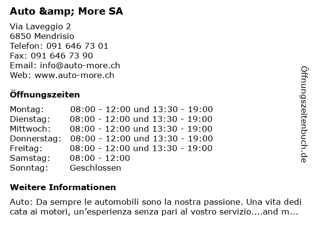 | Öffnungszeiten Auto & More SA in Mendrisio anzeigen | |