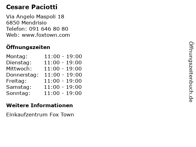 | Öffnungszeiten Cesare Paciotti in Mendrisio anzeigen | |
