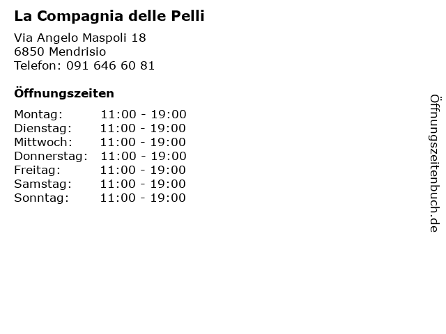 | Öffnungszeiten La Compagnia delle Pelli in Mendrisio anzeigen | |