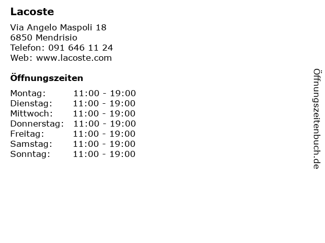 | Öffnungszeiten Lacoste in Mendrisio anzeigen | |
