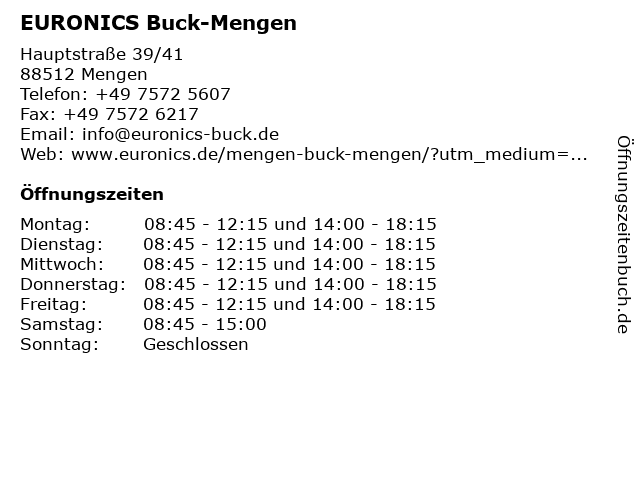 | Öffnungszeiten EURONICS Buck-Mengen in Mengen anzeigen | |