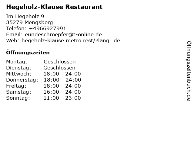 | Öffnungszeiten Hegeholz-Klause Restaurant in Mengsberg anzeigen | |