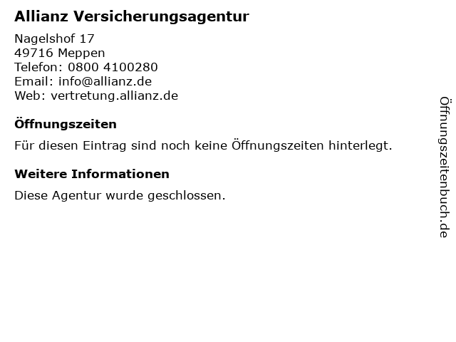 | Öffnungszeiten Allianz Versicherungsagentur in Meppen anzeigen | |