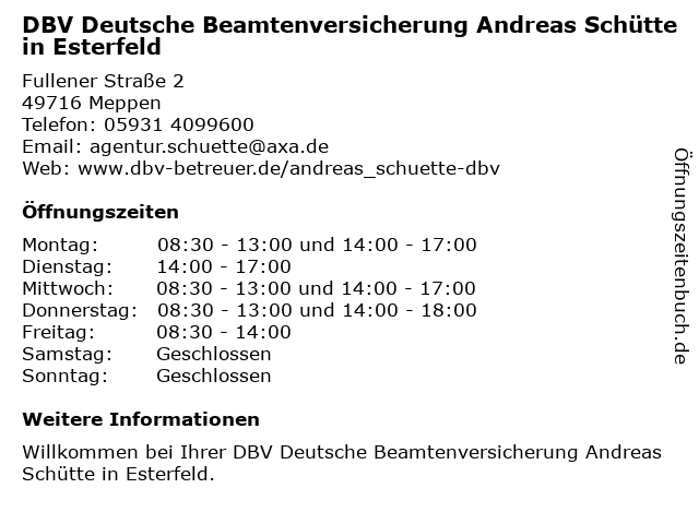 Branchen & Suchbegriffe zu DBV Deutsche Beamtenversicherung Andreas Schütte in Esterfeld:andreas, autoversicherung, beamtenversicherung, berufshaftpflichtversicherung, dbv, deutsche, esterfeld, gebäude- und hausratsversicherung, lebensversicherung, schütte, unternehmen für versicherungsfachfragen, zahnmedizinische versicherung |