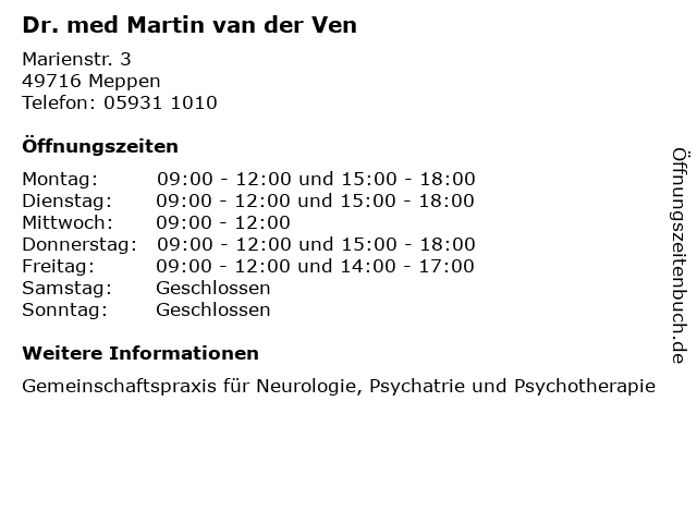 | Öffnungszeiten Dr. med Martin van der Ven in Meppen anzeigen | |