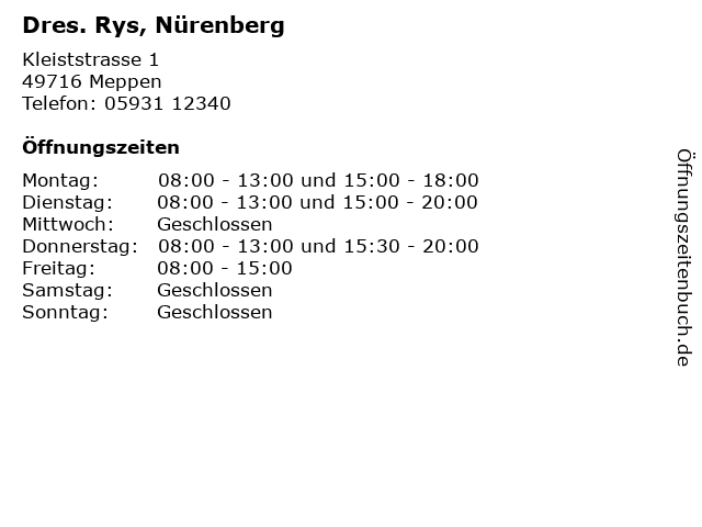 | Öffnungszeiten Dres. Rys, Nürenberg in Meppen anzeigen | |