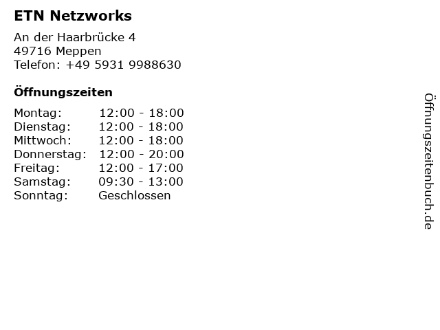 | Öffnungszeiten ETN Netzworks in Meppen anzeigen | |