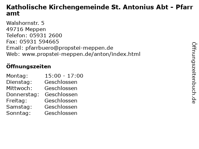 2 4 Katholische Kirchengemeinde St. Franz-Xaver - Pfarrbüro (Entfernung: 6,35 km) Franziskusplatz 2, 49716 Meppen 5 Katholische Kirchengemeinde St. Franz-Xaver - Bücherei (Entfernung: 6,35 km) Franziskusplatz 2, 49716 Meppen 6 |