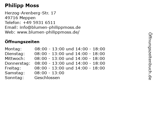 | Öffnungszeiten Philipp Moss in Meppen anzeigen | |