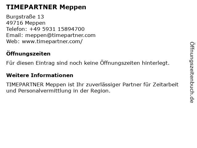 | Öffnungszeiten TIMEPARTNER Meppen in Meppen anzeigen | |