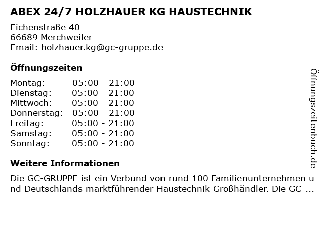 | Öffnungszeiten ABEX 24/7 HOLZHAUER KG HAUSTECHNIK in Merchweiler anzeigen | |