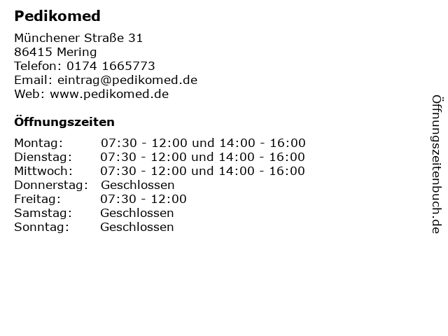 | Öffnungszeiten Pedikomed in Mering anzeigen | |