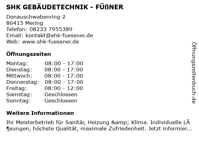 | Öffnungszeiten SHK GEBÄUDETECHNIK - FÜßNER in Mering anzeigen | |