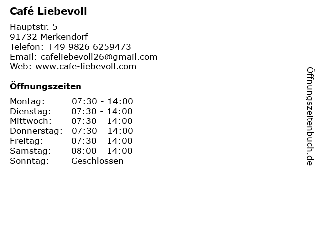 | Öffnungszeiten Café Liebevoll in Merkendorf anzeigen | |