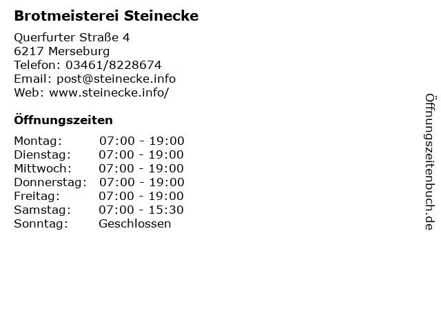 | Öffnungszeiten Brotmeisterei Steinecke in Merseburg anzeigen | |