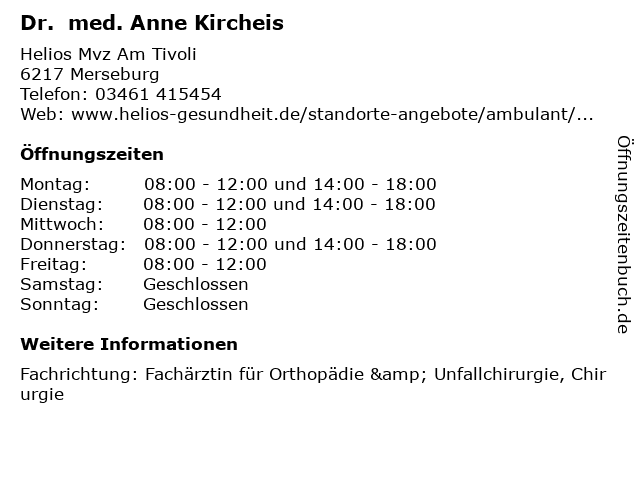 | Öffnungszeiten Dr. med. Anne Kircheis in Merseburg anzeigen | |