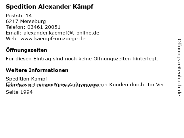 | Öffnungszeiten Spedition Alexander Kämpf in Merseburg anzeigen | |