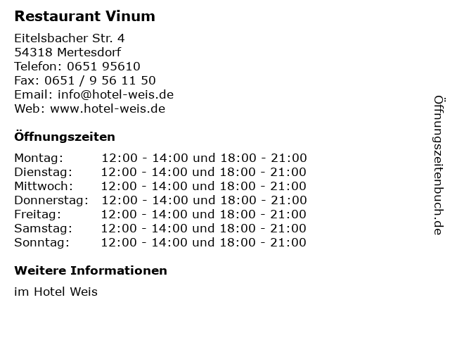 | Öffnungszeiten Restaurant Vinum in Mertesdorf anzeigen | |