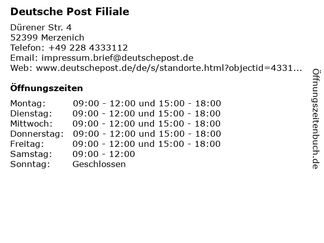 | Öffnungszeiten Deutsche Post Filiale in Merzenich anzeigen | |