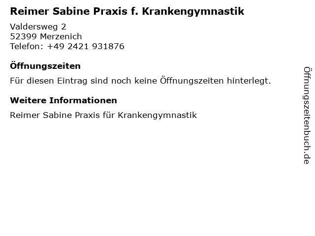 | Reimer Sabine Praxis f. Krankengymnastik anrufen | |