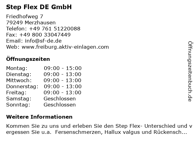 | Öffnungszeiten Step Flex DE GmbH in Merzhausen anzeigen | |