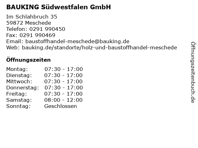 | Öffnungszeiten BAUKING Südwestfalen GmbH in Meschede anzeigen | |
