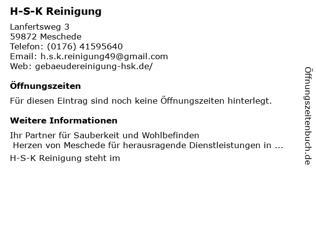 | Öffnungszeiten H-S-K Reinigung in Meschede anzeigen | |