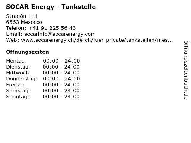| Öffnungszeiten SOCAR Energy - Tankstelle in Mesocco anzeigen | |