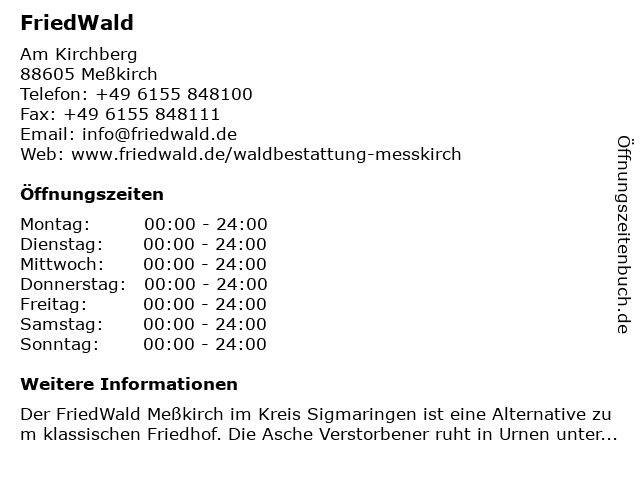 | Öffnungszeiten FriedWald in Meßkirch anzeigen | |
