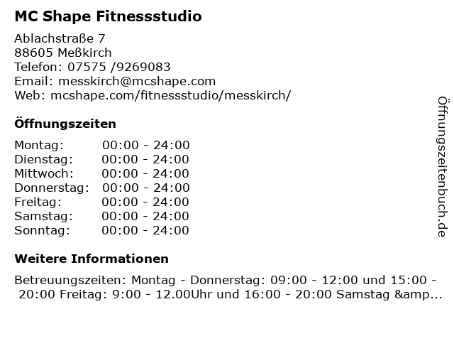 | Öffnungszeiten MC Shape Fitnessstudio in Meßkirch anzeigen | |
