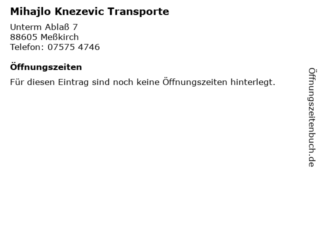 | Öffnungszeiten Mihajlo Knezevic Transporte in Meßkirch anzeigen | |
