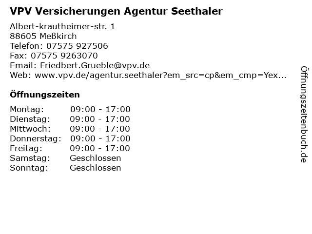 5 VPV LEBENSVERSICHERUNGS-AG - Karl-Heinz Boelke (Entfernung: 26,45 km) Eschenstraße 7, 72364 Obernheim 6 VPV Versicherungen Generalagentur Michael Voltin (Entfernung: 26,80 km) Vordere gasse 13, 72459 Albstadt |
