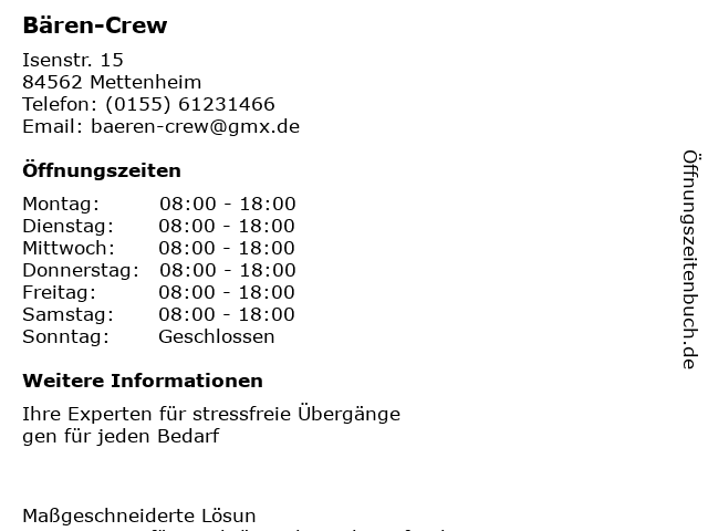 | Öffnungszeiten Bären-Crew in Mettenheim anzeigen | |