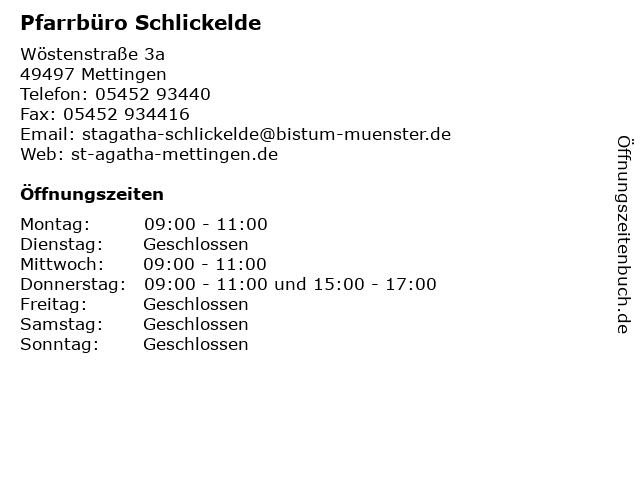 | Öffnungszeiten Pfarrbüro Schlickelde in Mettingen anzeigen | |