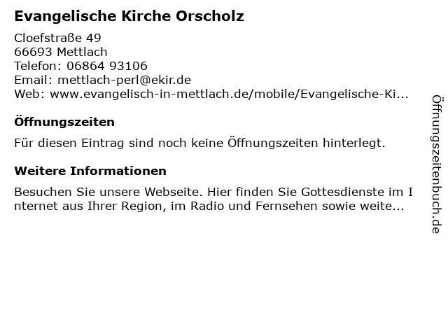 | Öffnungszeiten Evangelische Kirche Orscholz in Mettlach anzeigen | |