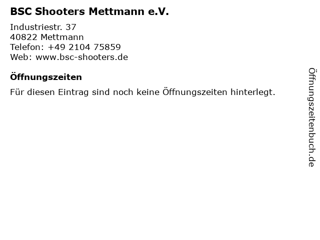 | Öffnungszeiten BSC Shooters Mettmann e.V. in Mettmann anzeigen | |
