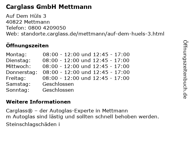 | Öffnungszeiten Carglass GmbH Mettmann in Mettmann anzeigen | |