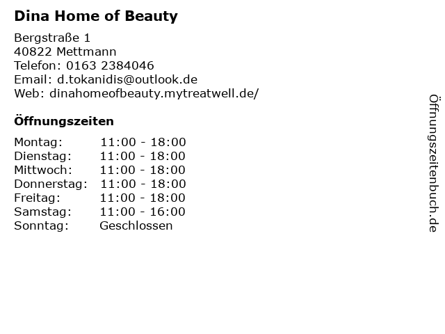 | Öffnungszeiten Dina Home of Beauty in Mettmann anzeigen | |