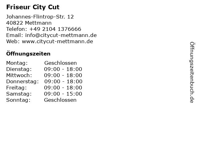 | Öffnungszeiten Friseur City Cut in Mettmann anzeigen | |