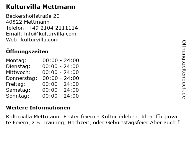 | Öffnungszeiten Kulturvilla Mettmann in Mettmann anzeigen | |