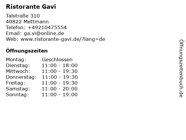 | Öffnungszeiten Ristorante Gavi in Mettmann anzeigen | |