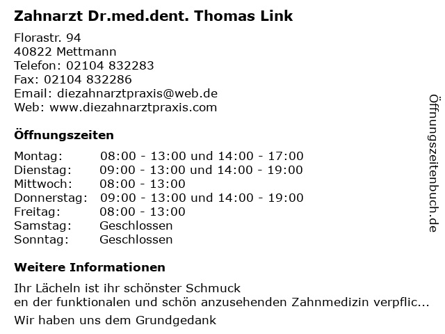 Branchen & Suchbegriffe zu Zahnarzt Dr.med.dent. Thomas Link:dr.med.dent., kinderzahnheilkunde, kosmetische zahnbehandlung, link, thomas, zahnarzt, zahnaufhellung, zahnersatz, zahnprothesen |