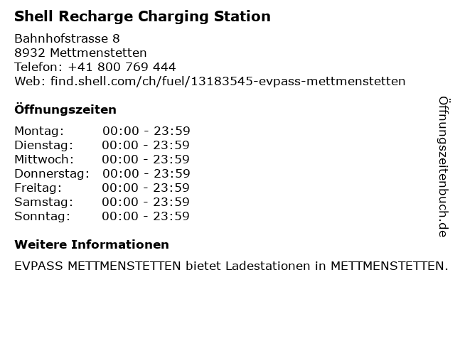 Shell Recharge Charging Station in Mettmenstetten: Telefonnummer, Öffnungszeiten und Adresse
