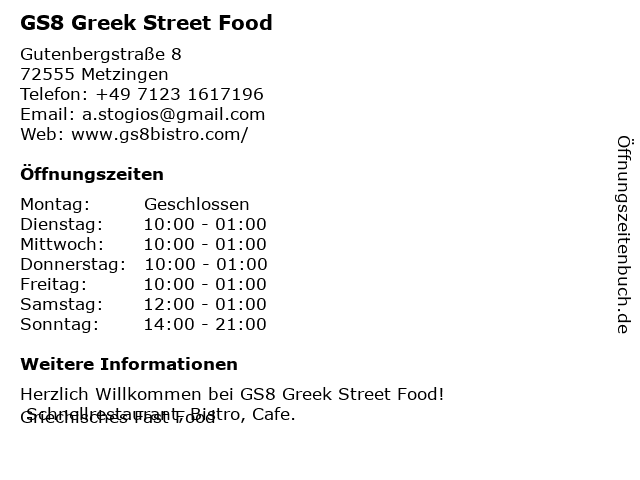 | Öffnungszeiten GS8 Greek Street Food in Metzingen anzeigen | |