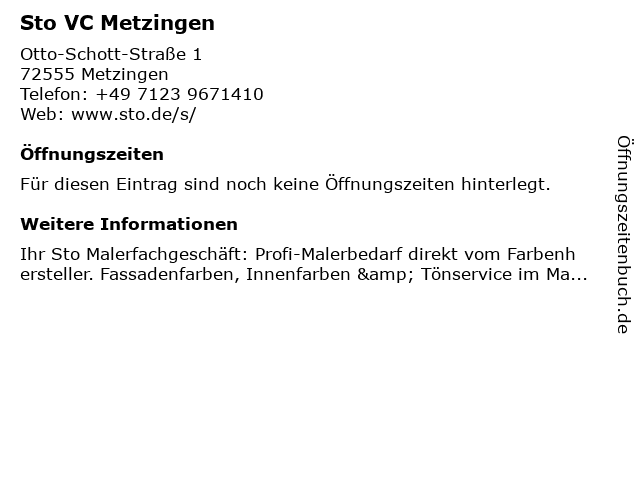 | Öffnungszeiten Sto VC Metzingen in Metzingen anzeigen | |