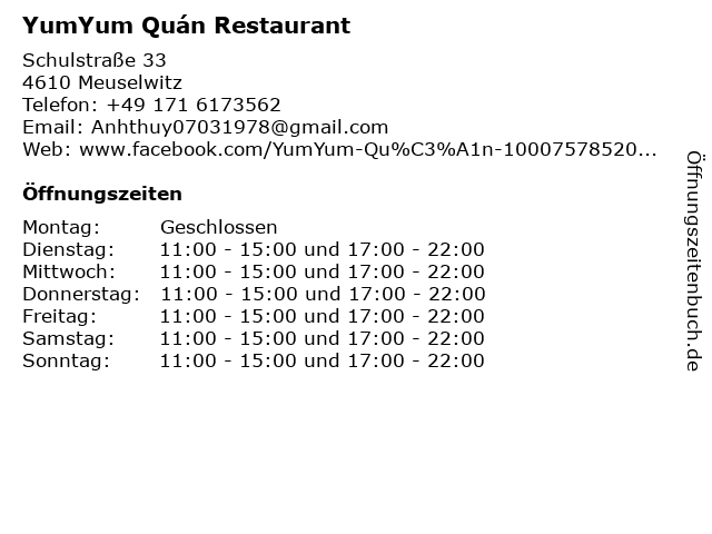 | Telefonnummer YumYum Quán Restaurant in Meuselwitz (+49 171 6173562) anrufen | |