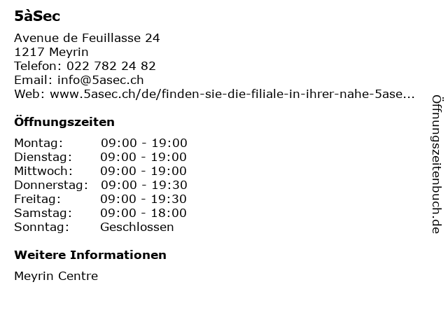 | Öffnungszeiten 5àSec in Meyrin anzeigen | |